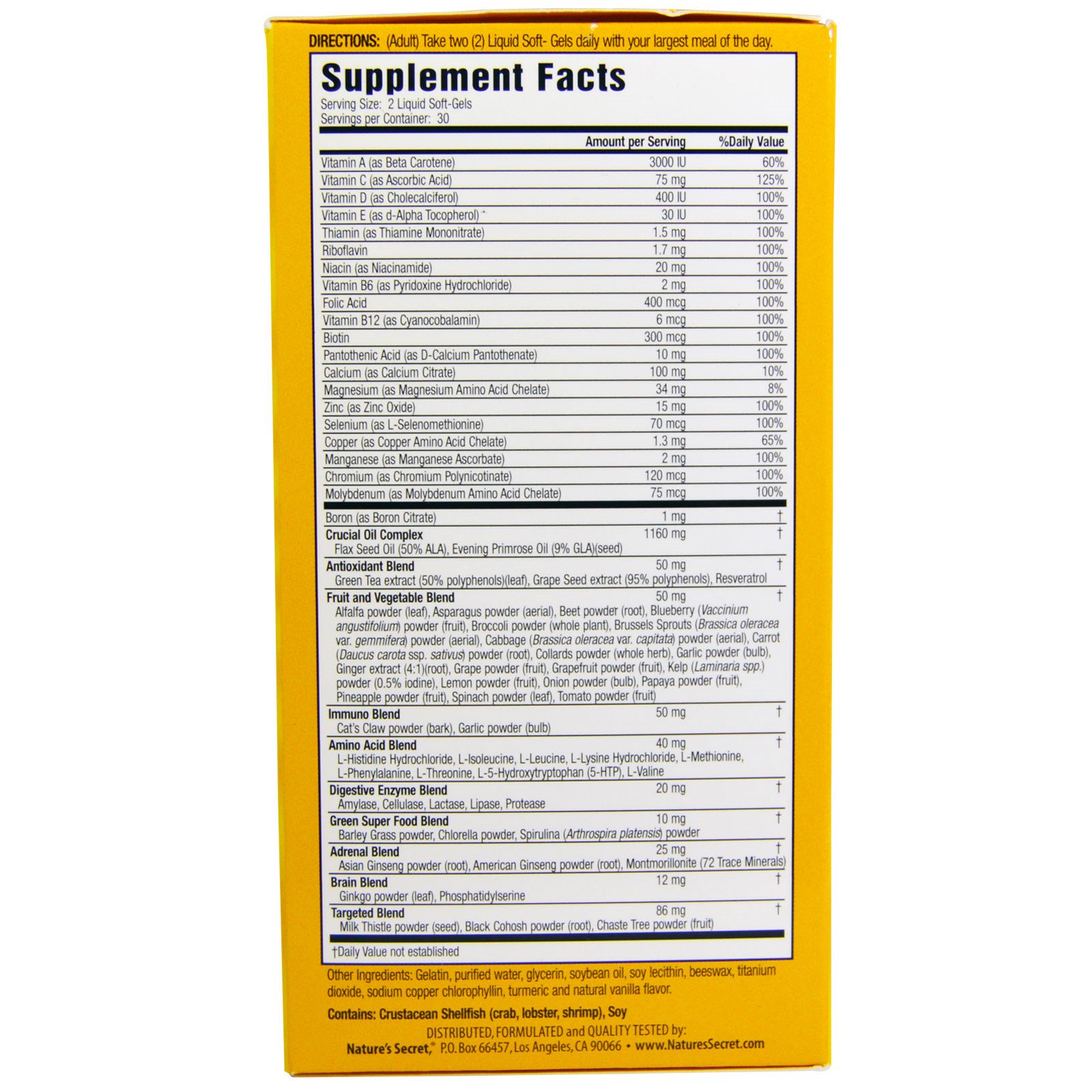 Directions: (Adult) Take two (2) Liquid Soft-Gels daily with your largest meal of the day.