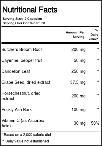 Veins Formula, with Tru-OPC’s, represents the powerful synergy of current scientific and traditional herbal medicine. Leg Veins Formula uses Tru-OPC’s to protect and strengthen collagen for healthy vascular walls. Horse Chestnut Extract to provide Aescin which has been shown to support healthy circulation in the lower legs. Vitamin C for additional collagen support, and vascular support herbs, traditionally used for micro-circulation. Other key ingredients include Horsechestnut Extract.