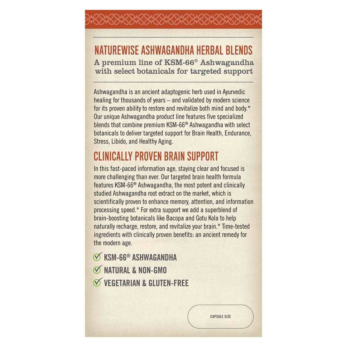 NatureWise Ashwagandha for Brain Health is a premium superblend of brain-boosting botanicals designed to help naturally recharge, restore, and revitalize your brain. Our targeted formula features KSM-66® Ashwagandha, a potent herbal extract that’s been clinically proven to help improve memory, focus, and information processing speed.*