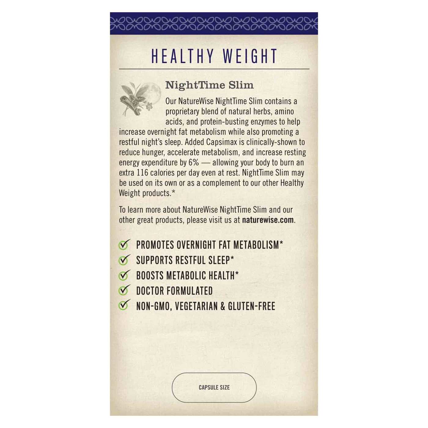 NatureWise NightTime Slim is a proprietary blend of natural herbs, amino acids and protein-busting enzymes. NatureWise unique foumula includes Capsimax® a highly active capsicum extract which is clinically shown to reduce hunger, accelerate metabolism, and increase resting calouie burning by 6%.*