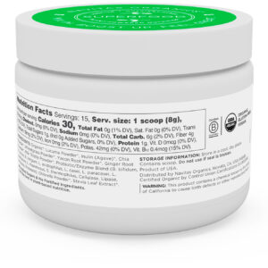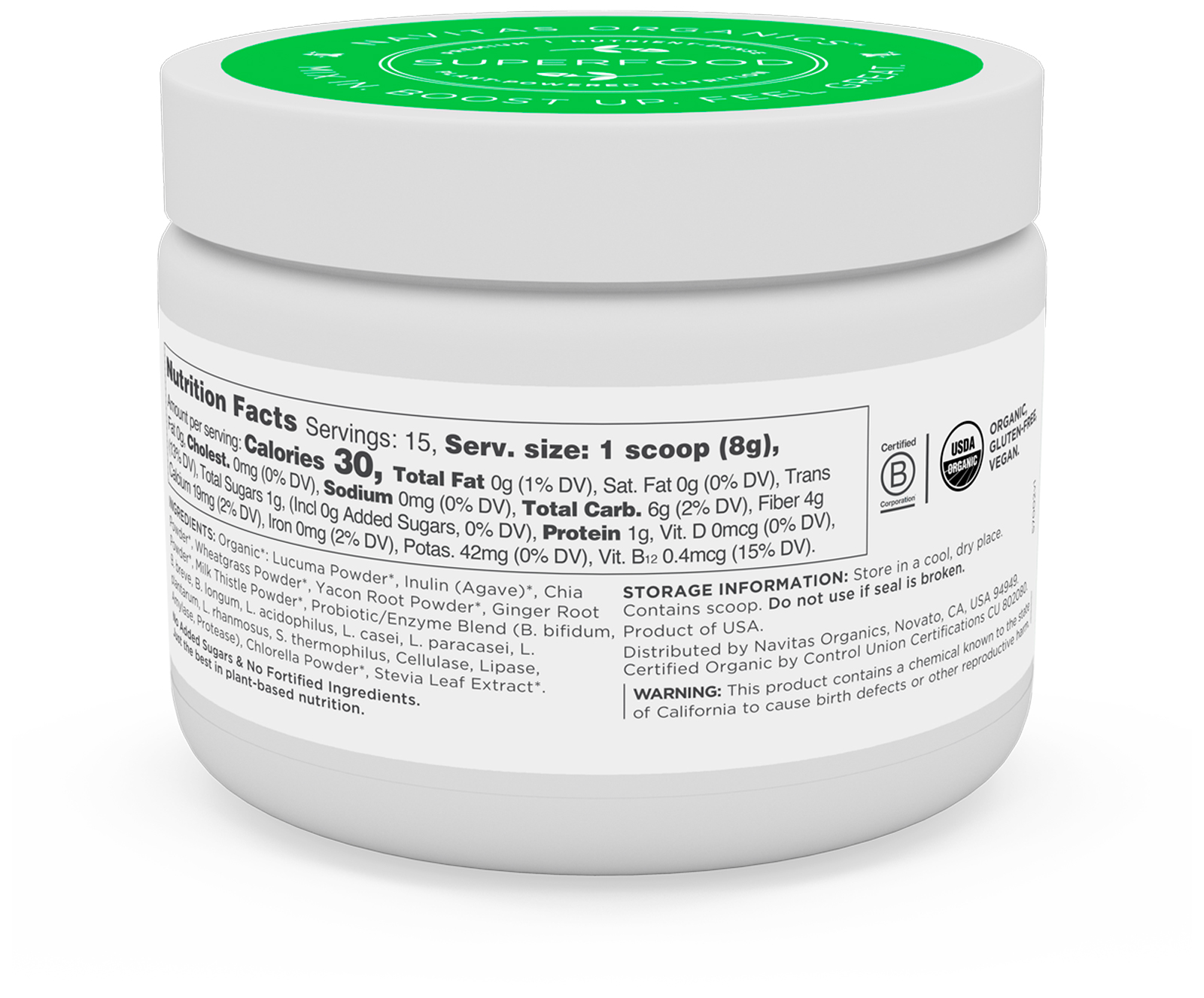 - 30 Calories – 8 Superfoods – 12.5 Bil CFU Probiotics – Per 8 g Serving