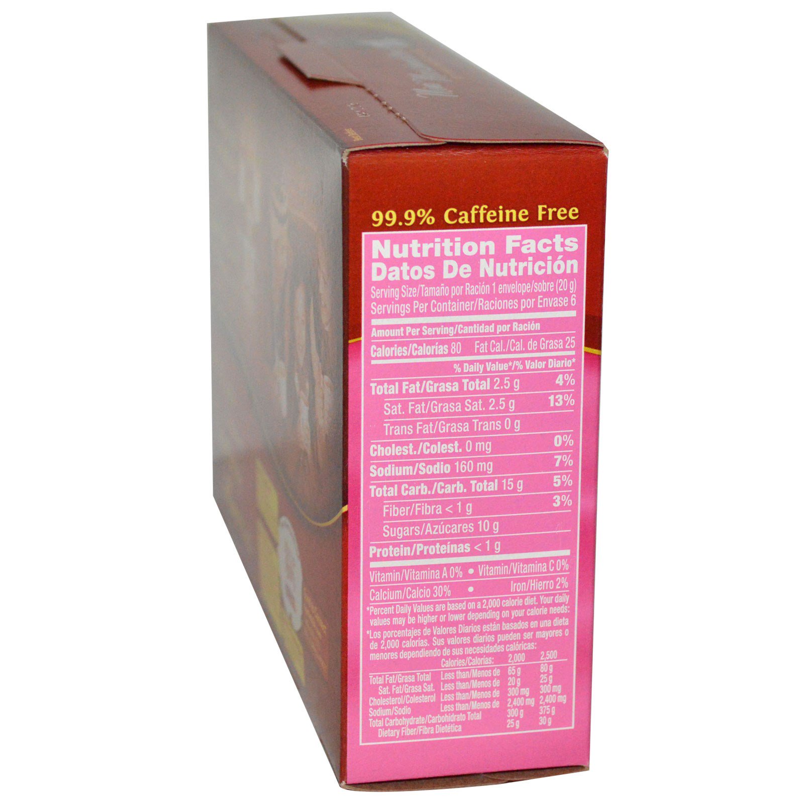 - 80 Calorias|2,5 g de gorduras saturadas-13% VD|160 mg de sódio -7% VD|10 g de açúcares|cálcio-30% VD| Por envelope