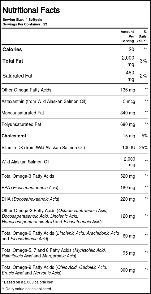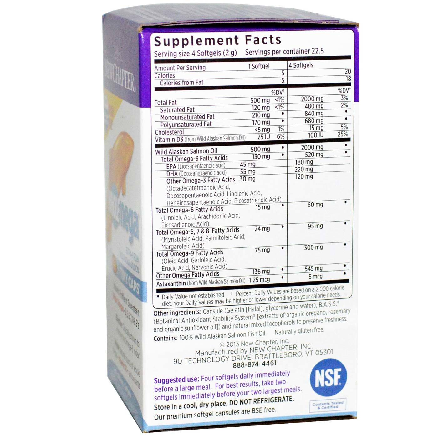 Notas: Store in a cool dry place. Do not refrigerate. Contains 100 percent Wild Alaskan Salmon Fish Oil. Naturally gluten free. New Chapter’s premium softgel capsules are prepared without any chemical solvents and are BSE free.
