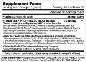 Unique Properties of some of the key compounds in Nitraflex: 1-Scoop Potency: Nitraflex is so potent, only 1 scoop (1 serving) is necessary. Do not exceed 1 scoop in a single 24-hour period. Do not take Nitraflex with 5 hours of bedtime. High Citrulline: Arginine Ratio: Arginine is a proven precursor in nitric oxide (NO), a vasodialator. What most people don’t know is that Arginine supplementation stimulates the activity of arginase, an enzyme that breaks down Arginine. Over time, this may actually result in reduced Arginine and NO levels in turn causing your preworkout formula to stop working. Research suggests that supplementing with a high ration of citrulline to Arginine may reduce this risk by avoiding overstimulation of arginase. 6 Weeks of Testosterone: