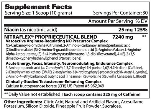 Unique Properties of some of the key compounds in Nitraflex: 1-Scoop Potency: Nitraflex is so potent, only 1 scoop (1 serving) is necessary. Do not exceed 1 scoop in a single 24-hour period. Do not take Nitraflex with 5 hours of bedtime. High Citrulline: Arginine Ratio: Arginine is a proven precursor in nitric oxide (NO), a vasodialator. What most people don’t know is that Arginine supplementation stimulates the activity of arginase, an enzyme that breaks down Arginine. Over time, this may actually result in reduced Arginine and NO levels in turn causing your preworkout formula to stop working. Research suggests that supplementing with a high ration of citrulline to Arginine may reduce this risk by avoiding overstimulation of arginase. 6 Weeks of Testosterone: