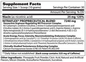 Unique Properties of some of the key compounds in Nitraflex: 1-Scoop Potency: Nitraflex is so potent, only 1 scoop (1 serving) is necessary. Do not exceed 1 scoop in a single 24-hour period. Do not take Nitraflex with 5 hours of bedtime. High Citrulline: Arginine Ratio: Arginine is a proven precursor in nitric oxide (NO), a vasodialator. What most people don’t know is that Arginine supplementation stimulates the activity of arginase, an enzyme that breaks down Arginine. Over time, this may actually result in reduced Arginine and NO levels in turn causing your preworkout formula to stop working. Research suggests that supplementing with a high ration of citrulline to Arginine may reduce this risk by avoiding overstimulation of arginase. 6 Weeks of Testosterone: