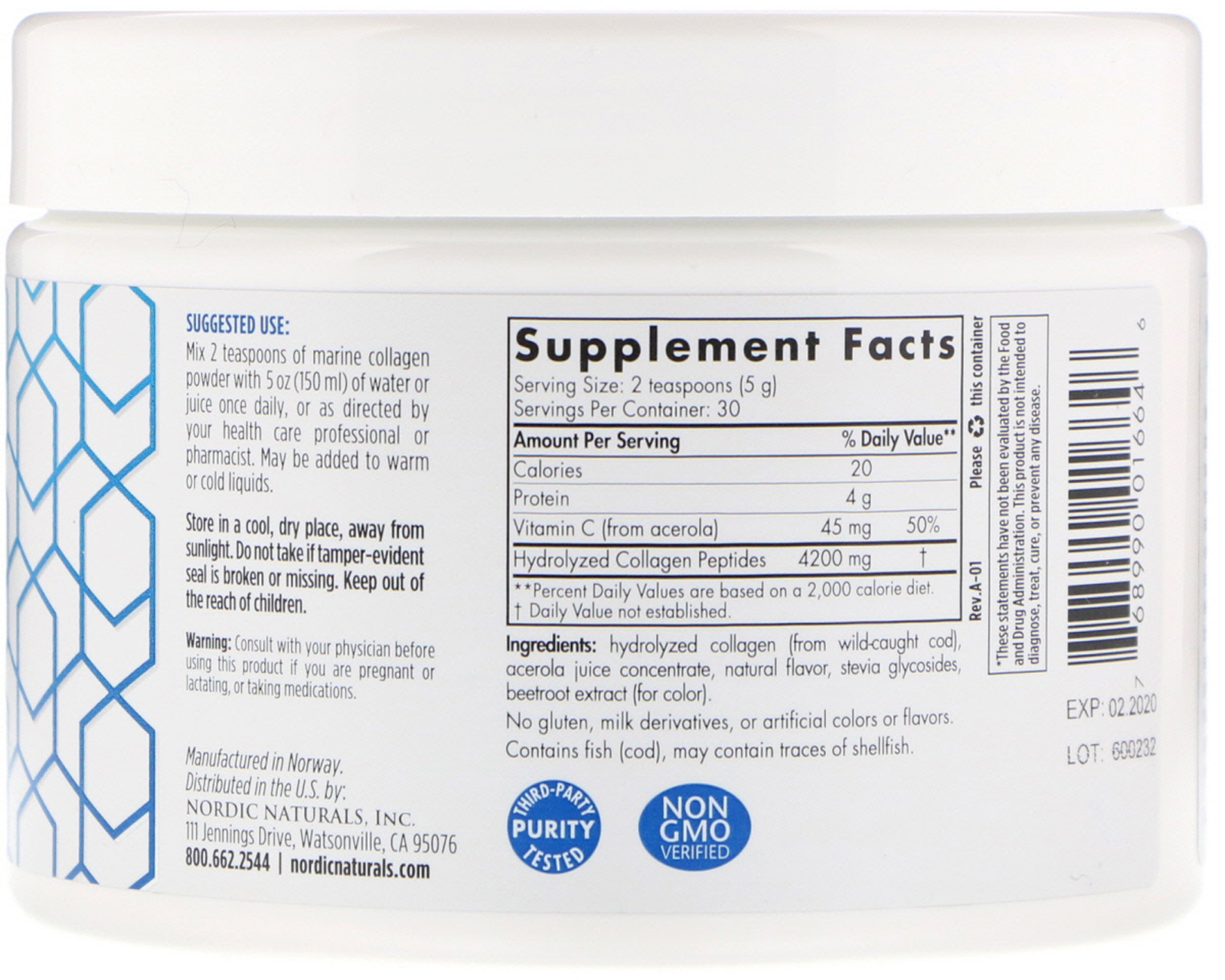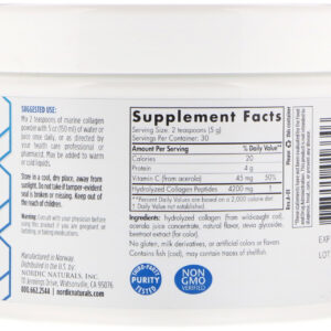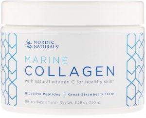 Nordic Naturals Marine collagen delivers bioactive type 1 collagen peptides from sustainable, wild-caught arctic cod. These small, hydrolyzed peptides are easily absorbed and help stimulate the body’s own collagen-producing cells. Collagen is a structural protein that provides strength, elasticity, and flexibility to skin, joints, and bones. Added natural vitamin C from acerola fruit provides antioxidant support and aids in normal collagen has a mild strawberry taste and dissolves easily in warm or cold liquids.