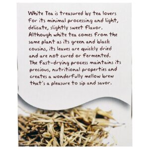 White tea is treasured by tea lovers for its minimal processing and light, delicate, slightly sweet flavor. Although white tea comes from the same plant as its green and black cousins, its leaves are quickly dried and are not cured or fermented. The fast-drying process maintains its precious, nutritional properties and creates a wonderfully mellow brew that’s a pleasure to sip and savor.