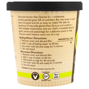 Everyone knows that Quinoa is a wholesome, protein-packed grain full of nutrition. But who knew it could taste this good and be easy to make? We take the goodness of naturally gluten-free Quinoa and combine it with shiitake mushrooms and our chef’s irresistible blend of garlic, onion and seasonings for a delicious snack or meal that you won’t believe came out of a cup.
