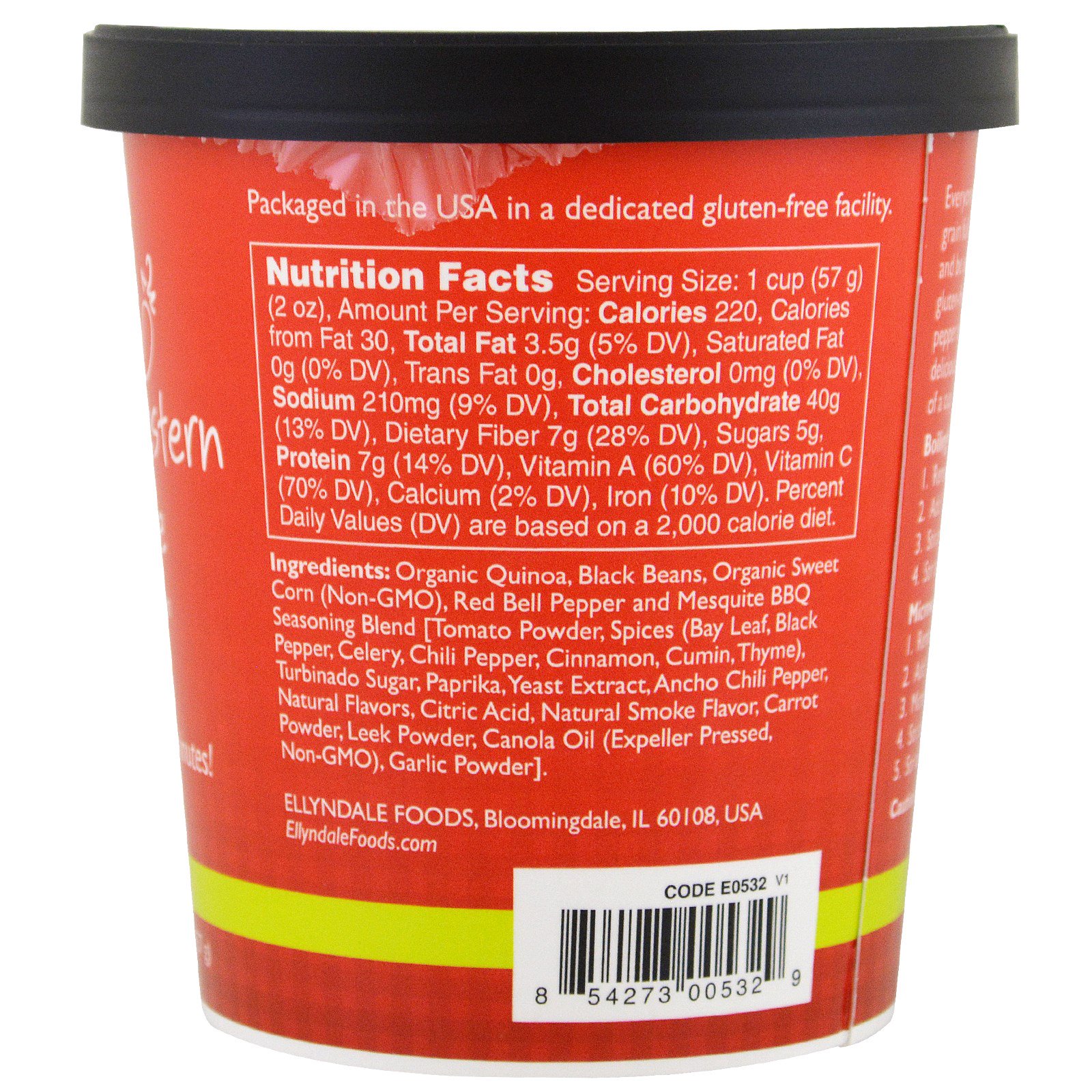 Quinoa orgânica, feijão preto, milho doce orgânico (não-OGM), pimentão vermelho e Mesquite BBQ Seasoning Blend [Pó de tomate, especiarias (folha de louro, pimenta preta, aipo, pimenta, canela, cominho, tomilho), açúcar Turbinado, Paprika, Extracto de Levedura, Pimenta Ancho Chili, Sabores Naturais, Ácido cítrico, Sabor Natural de Fumo, Pó de cenoura, Pó de alho-poró, Óleo de canola (Expulsão pressionada, não-OGM), Pó de alho].