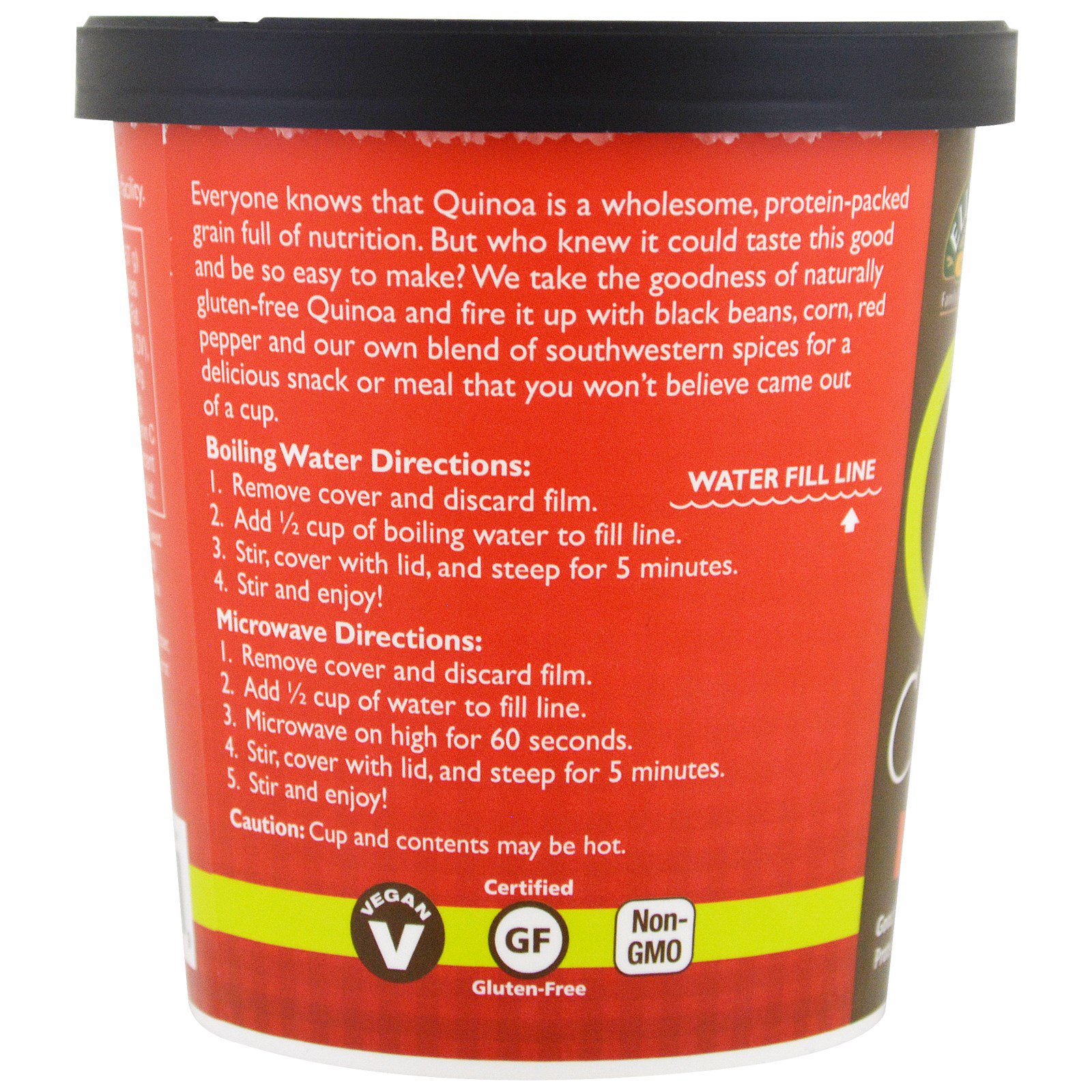 Everyone knows that Quinoa is a wholesome, protein-packed grain full of nutrition. But who knew it could taste this good and be easy to make? We take the goodness of naturally gluten-free Quinoa and fire it up with black beans, corn, red, pepper, and our own blend of southwestern spices for a delicious snack or meal that you won’t believe came out of a cup.
