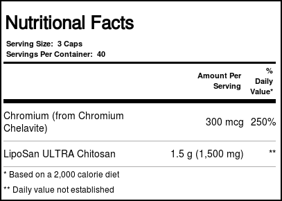 Recomendações de uso: As a dietary supplement, take 3 capsules with each meal. Refrain from taking Chitosan 4 hours before or after the ingestion of fat soluble vitamins (i.e., A,D,E,K) or any medications.