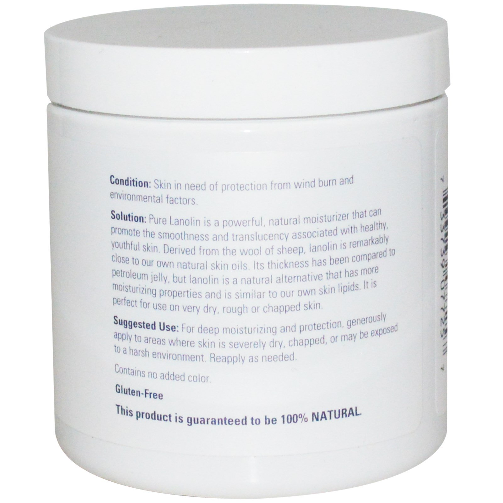 Solução: Lanolina pura é um hidratante natural e poderoso, que pode promover a maciez e translucência associada à pele saudável e jovem. Derivada da lã das ovelhas, a lanolina é muito próxima de nossos próprios óleos naturais da pele. Sua textura pode ser comparada com vaselina, mas a lanolina é uma alternativa natural que tem mais propriedades hidratantes e é similar aos nossos próprios lipídios da pele. É perfeito para usar na pele muito seca, áspera ou rachada.