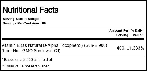 Vitamin E functions as an antioxidant inside the body, providing a defense against lipid peroxidation. In particular, it helps protect against breakdowns at the cellular level. Sun-E 400 provides 400 IU of this valuable antioxidant in every softgel. You’re getting a natural form of the vitamin derived without soy from non-GMO sunflower seed oil.