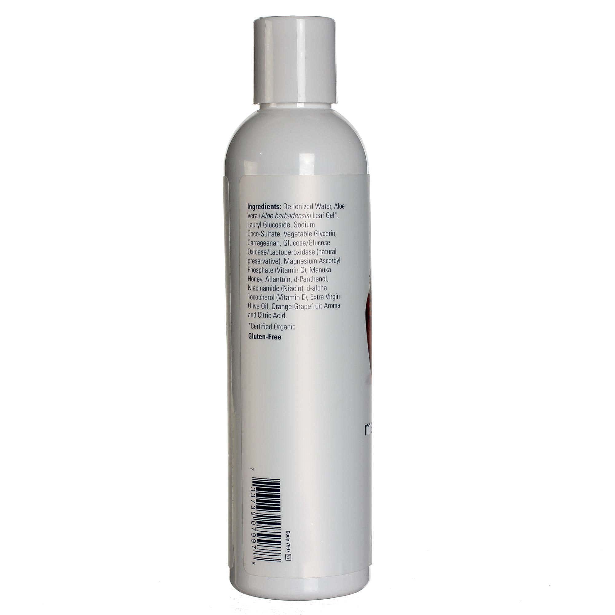 Nota: Ingredients: De-ionized Water, Aloe Vera (Aloe barbadensis) Leaf Gel, Lauryl Glucoside, Sodium Coco-Sulfate, Vegetable Glycerin, Carrageenan, Glucose/Glucose Oxidase/Lactoperoxidase (natural preservative), Magnesium Ascoubyl Phosphate (Vitamin C), Manuka Humay, Allantoin, d-Panthenol, Niacinamide (Niacin), d-alpha Tocpherol (Vitamin E), Extra Virgin Olive Oil, Orange-Grapefruit Aroma and Citric Acid.