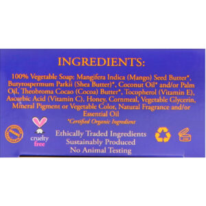 100% Vegetable soap: mangifera indica (mango) seed butter*, butyrospermum parkii (shea butter)*, coconut oil* and/or palm oil, theobroma cocoa (cocao) butter*, tocopherol (vitamin E), ascorbic acid (vitamin C), honey, cornmeal, vegetable glycerin, mineral pigment or vegetable color, natural fragrance and/or essential oil.