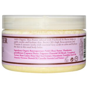 100% Orgânico, o Shea Butter infused with Patchouli & Buriti ajuda a levantar, suavizar e hidratar a pele. O alto teor de Beta-caroteno e de Vitamina E do Óleo de Buriti trabalha com ácidos graxos essenciais para alcamar e hidratar a pele neste bálsamo completo para o corpo.
