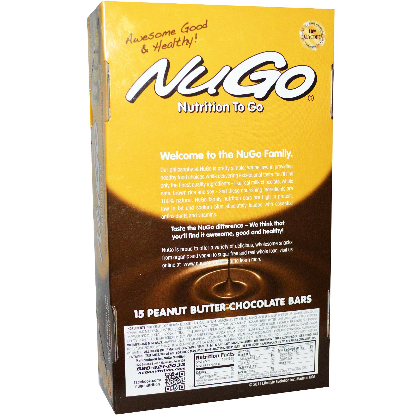 Our philosophy at NuGo is pretty simple: we believe in providing healthy food choices while delivering exceptional taste. You’ll find only the finest quality ingredients – like real milk chocolate, whole oats, brown rice and soy – and these nourishing ingredients are 100% natural. NuGo family nutrition bars are high in protein, low in fat and sodium plus absolutely loaded with essential antioxidants and vitamins.
