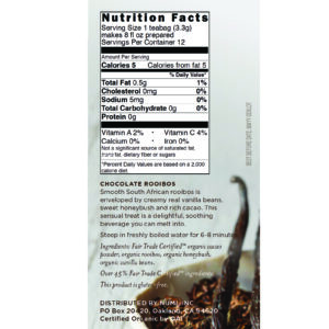 Smooth South African rooibos is enveloped by creamy real vanilla beans, sweet honeybush and rich cacao. This sensual treat is a delightful, soothing beverage you can melt into.