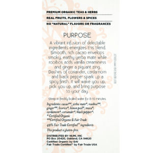 A vibrant infusion of delectable ingredients energizes this blend. Smooth, rich cacao envelops smoky, earthy yerba mate while rooibos adds vanilla creaminess and ginger a piquant zing. Dashes of coriander, cardamom and black pepper spark up a spicy finish. It will wake you up, pick you up, and bring purpose to your day.