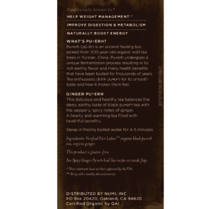 Verified fair labor organic black pu•erh tea, organic ginger.