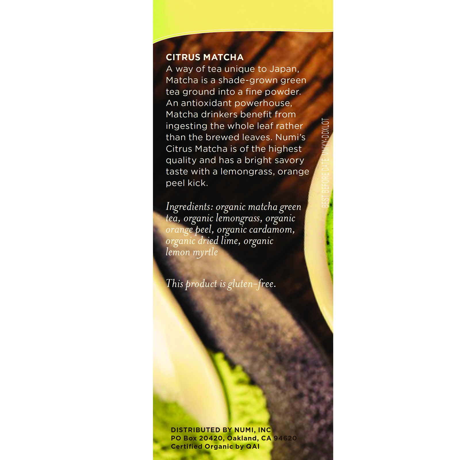 Chá verde matcha orgânico, citrino orgânico, casca de laranja orgânica, cardamomo orgânico, lima seca orgânica, mirto orgânico de limão.