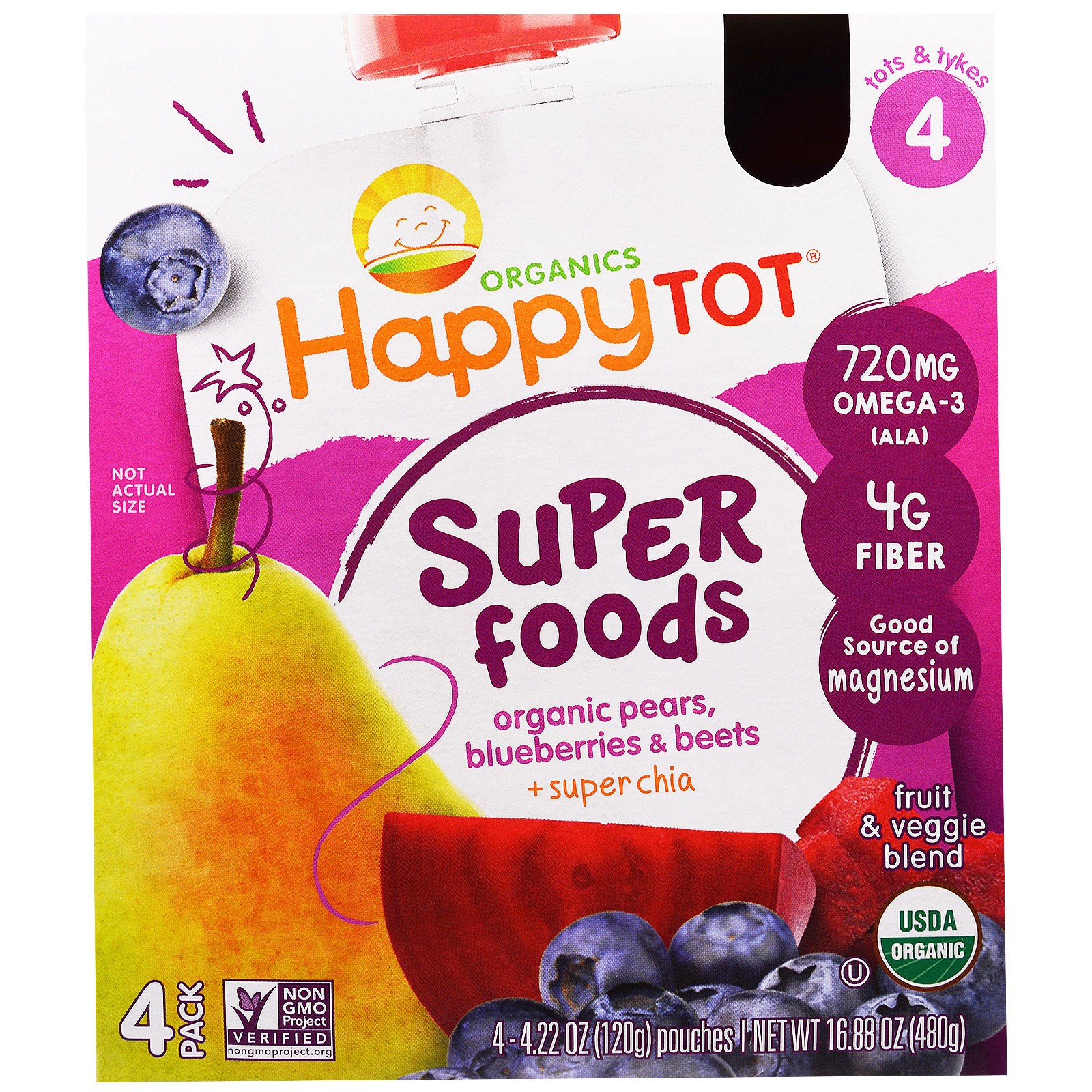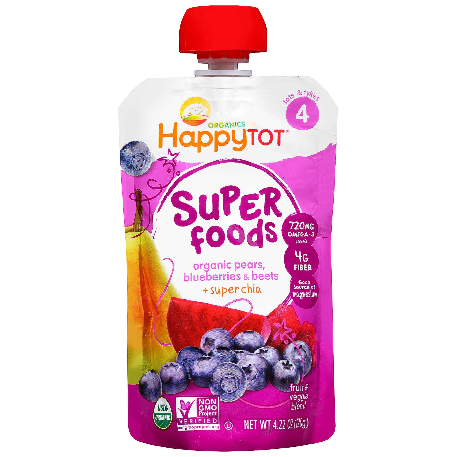 Nurture Inc. (Happy Baby), Happy Tot, Mix de Frutas e Vegetais , Peras Orgânicas, Blueberries e Beterrabas + Superchia, Fase 4, 4 Pacotes – 4,22 oz (120 g) Cada