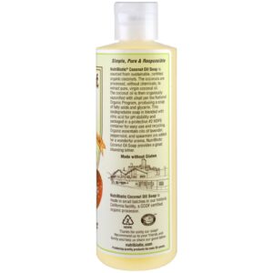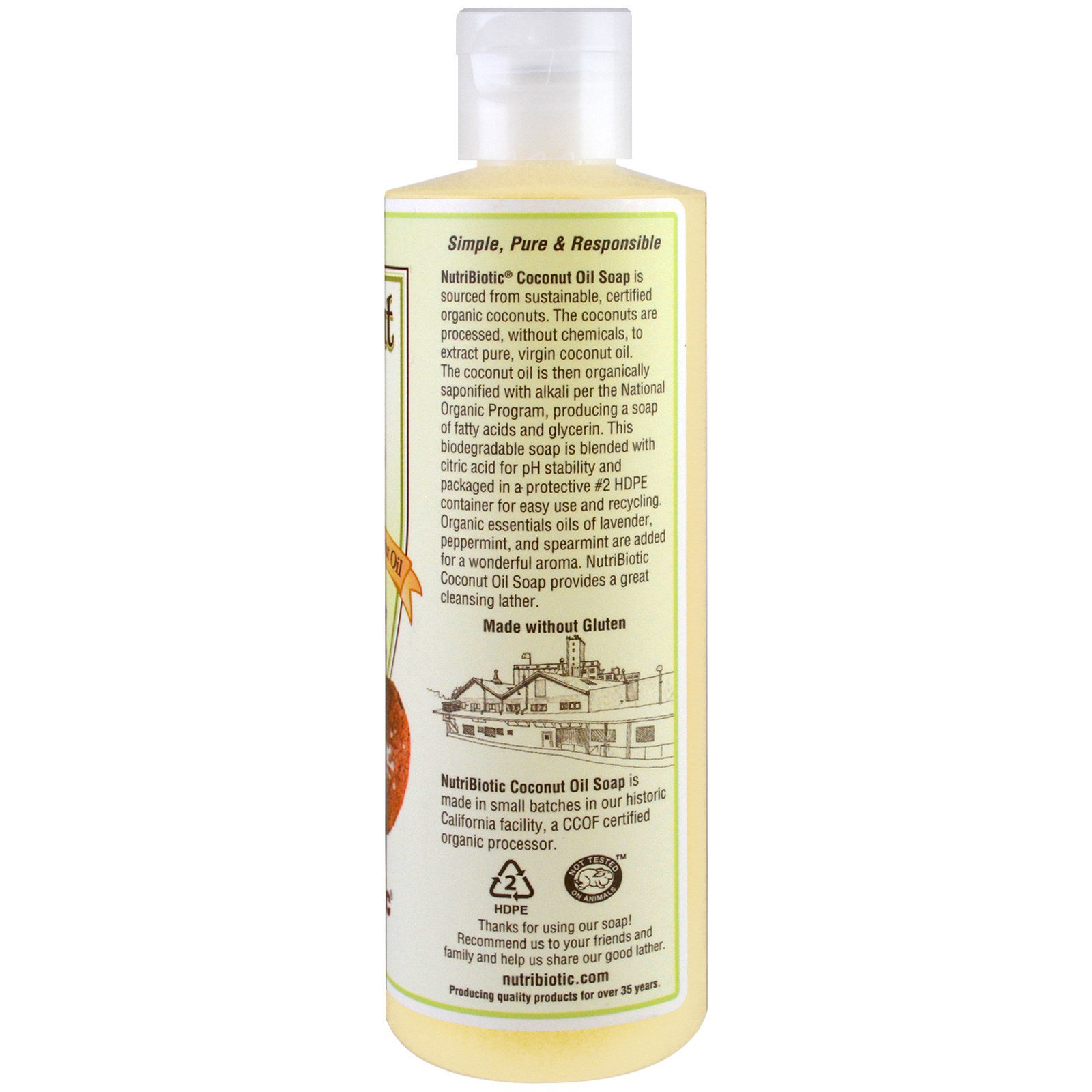 NutriBiotic Coconut Oil Soap is sourced from sustainable, certified organic coconuts. The coconuts are processed, without chemicals, to extract pure, virgin coconut oil. The coconut oil is then organically saponified with alkali per the National Organic Program, producing a soap of fatty acids and glycerin. This biodegradable soap is blended with citric acid for pH stability and packaged in a protective #2 HDPE container for easy use and recycling. Organic essentials oils of lavender, peppermint, and spearmint are added for a wonderful aroma. NutriBiotic Coconut Oil Soap provides a great cleansing lather.