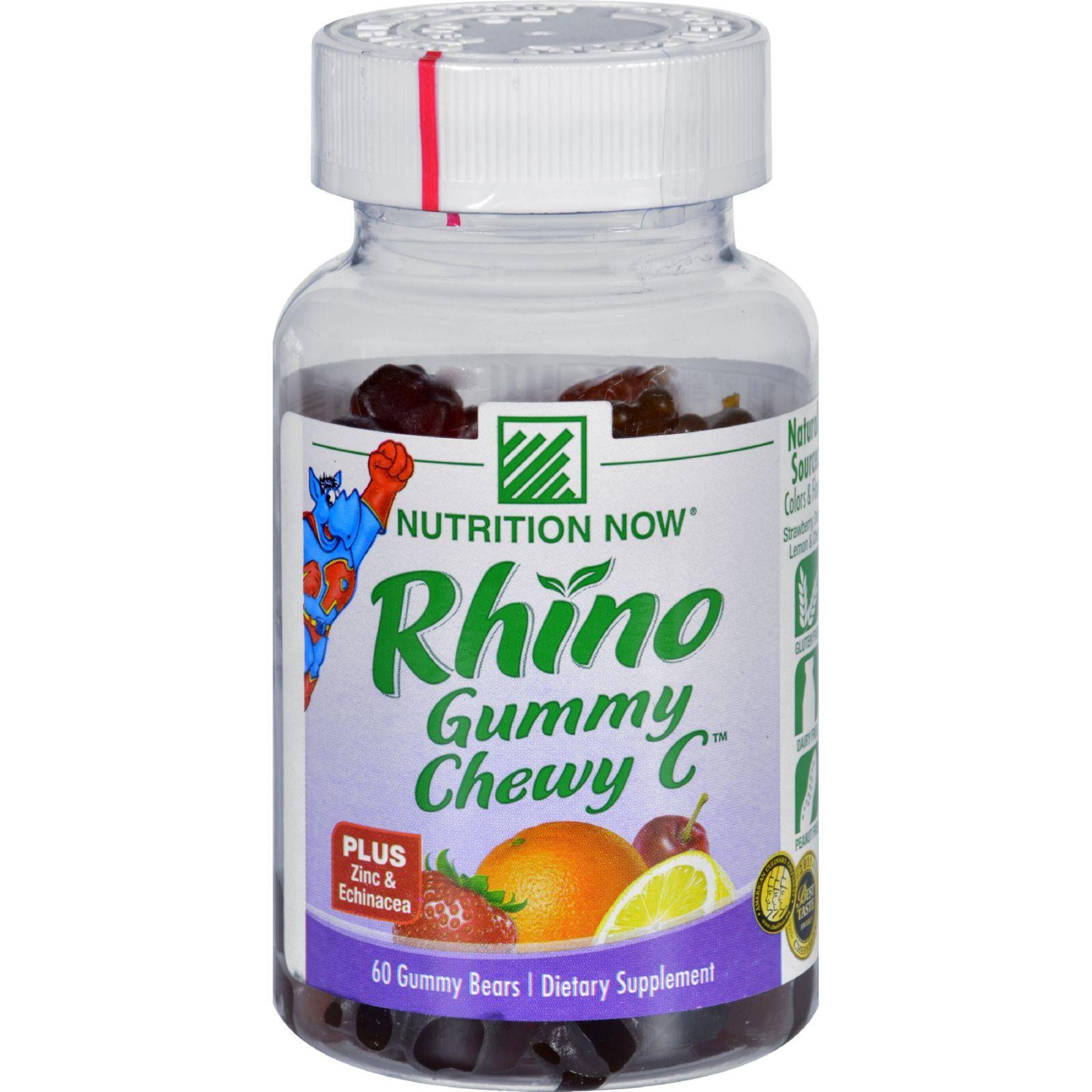 Nutrition Now Rhino Gummy Chewy C Strawberry Orange Lemon and Cherry Description: Plus Zinc and Echinacea Natural Colors and Flavors Dairy Free, Peanut Free, Gulten Free Free Of Wheat, (gluten), milk, eggs, peanuts, or soy. Disclaimer These statements have not been evaluated by the FDA. These products are not intended to diagnose, treat, cure, or prevent any disease.