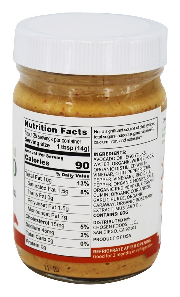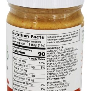 | Ingredientes: Óleo de abacate, gemas de ovo, água, ovos inteiros orgânicos, vinagre branco destilado orgânico, pimenta (pimenta, vinagre), pimentão vermelho, mel orgânico, sal, pimenta vermelha orgânica, cominhos orgânicos, coentro orgânico, purê de alho, alcatifa orgânica , Extracto orgânico de alecrim, óleo de mostarda.