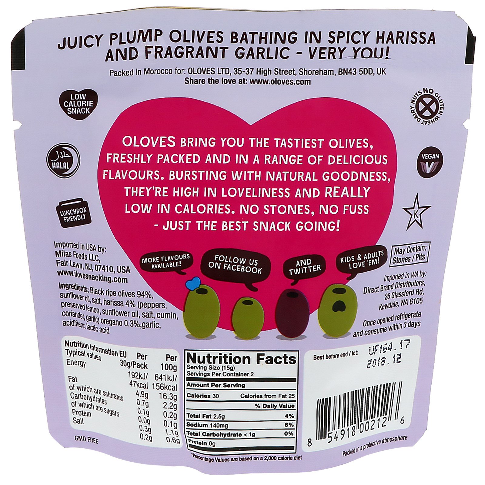 Black ripe olives 94%, sunflower oil, salt, harissa 4% (peppers, preserved lemon, sunflower oil, salt, cumin, coriander, garlic) oregano 0.3%, garlic, acidifiers: lactic acid.