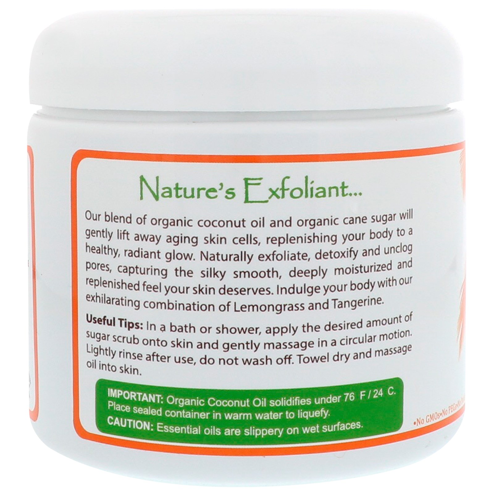 Our blend of organic coconut oil and organic cane sugar will gently lift away aging skin cells, replenishing your body to a healthy, radiant glow. Naturally exfoliate, detoxify and unclog pores, capturing the silky smooth, deeply moisturized and replenished feel your skin deserves. Indulge your body with our exhilarating combination of Lemongrass and Tangerine.