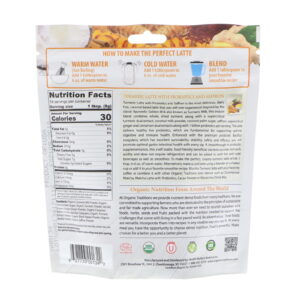Turmeric Latte with Probiotics and Saffron is the most delicious, dairy free, coconut based latte that you will ever experience! Inspired by the classic Ayurvedic Golden Milk also known as Turmeric Milk, this instant blend combines whole, dried turmeric along with a supercritical turmeric dual extract, coconut milk powder, coconut palm sugar, saffron, supercritical ginger and cinnamon dual extracts along with 1 billion probiotics per serving. This latte delivers healthy live probiotics, which are fundamental for supporting optimal digestive and immune health. Enhanced with the premium probiotic Bacillus coagulans, which has excellent survivability, stability, safety and efficacy, you will promote optimal gastro-intestinal health with every sip. A breakthrough in probiotic supplementation, this shelf stable, food-friendly beneficial bacteria survives stomach acidity and does not require refrigeration and can be added to both hot and cold beverages as well as smoothies. To make the perfect, creamy turmeric latte whisk 1 tbsp in 6 oz of warm water. Alternatively make a cold latte using a blender or a shaker cup or add it to your favorite smoothie recipe. Mix this Turmeric latte with your favorite coffee or combine it with other Organic Traditions latte blends such as Ceremonial Matcha, Matcha Latte with Probiotics, Cacao Powder or Macaccino drink Mix.