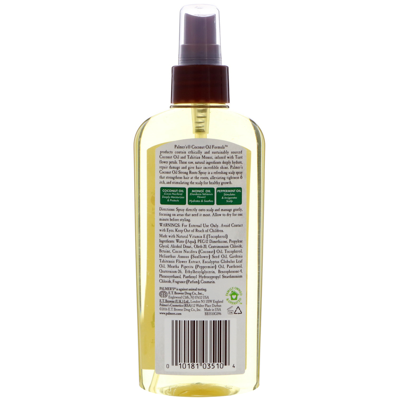 Os produtos com a fórmula de óleo de coco da Palmer contêm óleo de coco e monoi do Taiti colhidos de forma ética e sustentável, em conjunto com pétalas de flores de Tiaré. Esses ingredientes puros e naturais hidratam profundamente, reparam danos e dão ao cabelo um brilho incrível. O forte spray para raízes da Palmer é um refrescante spray para o couro cabeludo, que fortalece os cabelos nas raízes, aliviando a impermeabilidade e a coceira e estimulando o escalpo para promover o crescimento saudável.