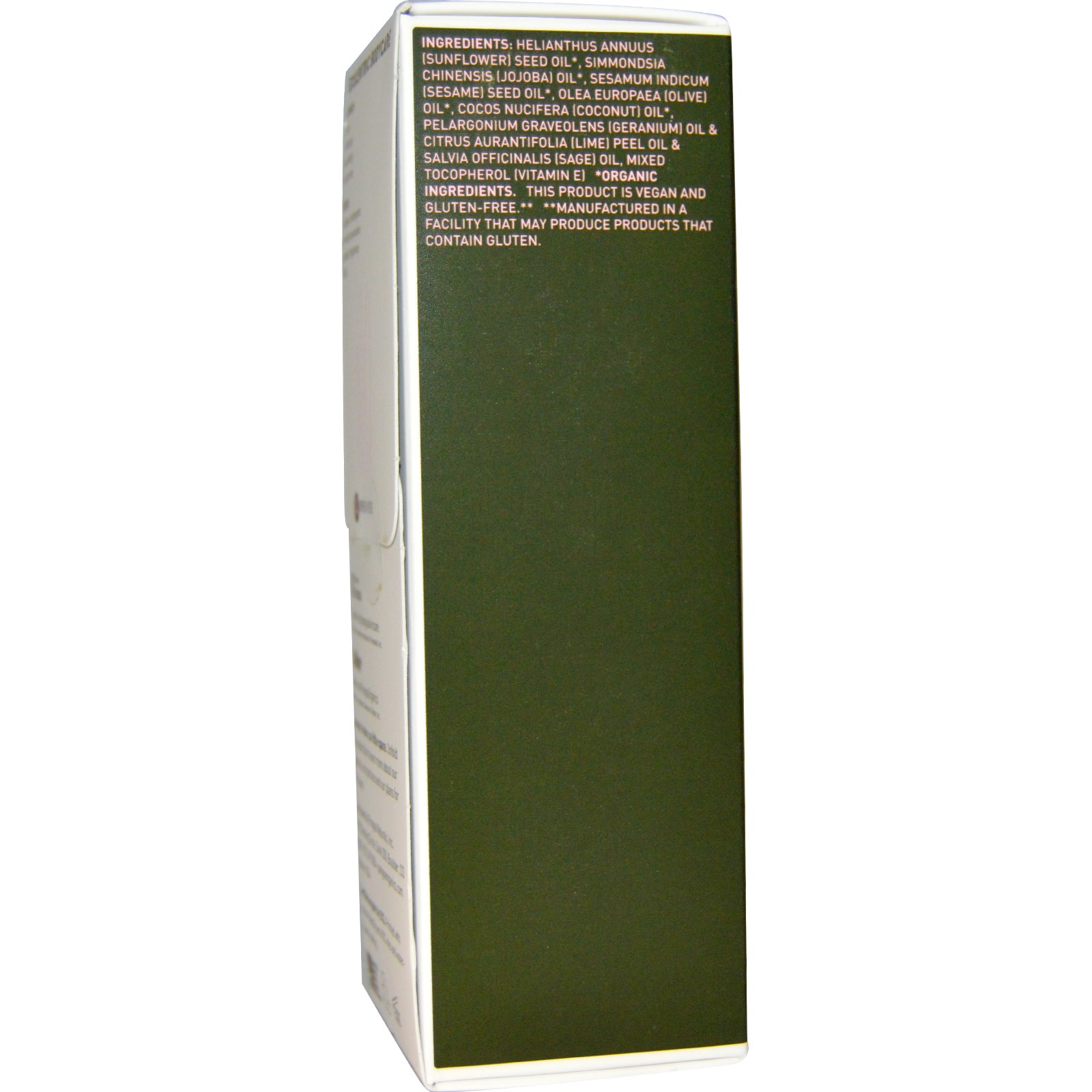 Óleo de semente de Helianthus annuus (girassol) *, Óleo de simmondsia chinensis (óleo de jojoba orgânico) *, Óleo de semente de sesamum indicum (sésamo) *, Óleo de olea europaea (azeitona) *, Óleo de coco nucifera *, Óleo de pelargonium graveolens & Citrus aurantifolia (cal) óleo de casca e óleo de sálvia officinalis (sálvia), tocoferol misturado (vitamina E)