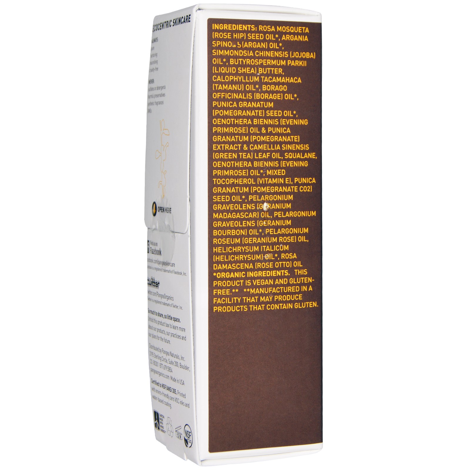 Rosa Mosqueta (rosa) óleo de semente *, argania spinosa (argan) óleo *, simmondsia chinensis (jojoba) óleo *, butyrospermum parkii (manteiga líquida) manteiga, calophyllum tacamahaca (tamanu) óleo *, borago officinalis (borragem) óleo * extracto de punica granatum (granada) e óleo de folha de camélia sinensis (chá verde), squalane, oenethera biennis (óleo de prímula) *, óleo de semente de tocoferol (vitamina E), punica granatum (pomegranate CO2) *, pelargonium graveolens (geranium madagascar) óleo de pelargonium graveolens (óleo de bourbon de gerânio), óleo de pelargonium roseum (óleo de rosa de gerânio), óleo de helichrysum italicum (helichrysum) *, óleo de rosa damascena (rose otto)