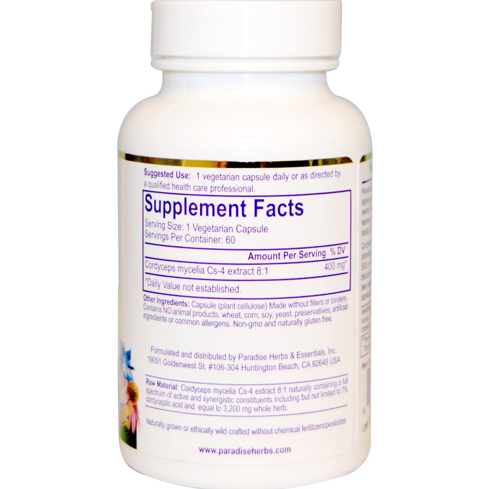 Cordyceps mycelia, conhecido como Cs-4, tem diversas propriedades promotoras da saúde. Promove a capacidade natural do organismo de produzir o SOD, um antioxidante vital e importante por seu papel de combate aos radicais livres que podem causar envelhecimento prematuro e dano celular. O Cordyceps tem sido usado há séculos para apoiar a atividade física, desempenho, estamina e resistência.