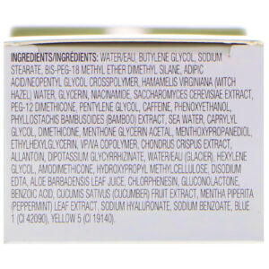 Water/eau, butylene glycol, sodium stearate, bis-peg-18 methyl ether dimethyl silane, adipic acid/neopentyl glycol crosspolymer, hamamelis virginiana (witch hazel) water, glycerin, niacinamide, saccharomyces cerevisiae extract, peg-12 dimethicone, pentylene glycol, caffeine, phenoxyethanol, phyllostachis bambusoides (bamboo) extract, sea water, caprylyl glycol, dimethicone, menthone glycerin acetal, menthoxypropanediol, ethylhexylglycerin, vp/va copolymer, chondrus crispus extract, allantoin, dipotassium glycyrrhizinate, water/eau (glacier), hexylene glycol, amodimethicone, hydroxypropyl methylcellulose, disodium edta, aloe barbadensis leaf juice, chlorphenesin, gluconolactone, benzoic acid, cucumis sativus (cucumber) fruit extract, mentha piperita (peppermint) leaf extract, sodium hyaluronate, sodium benzoate, blue 1 (ci 42090), yellow 5 (ci 19140).