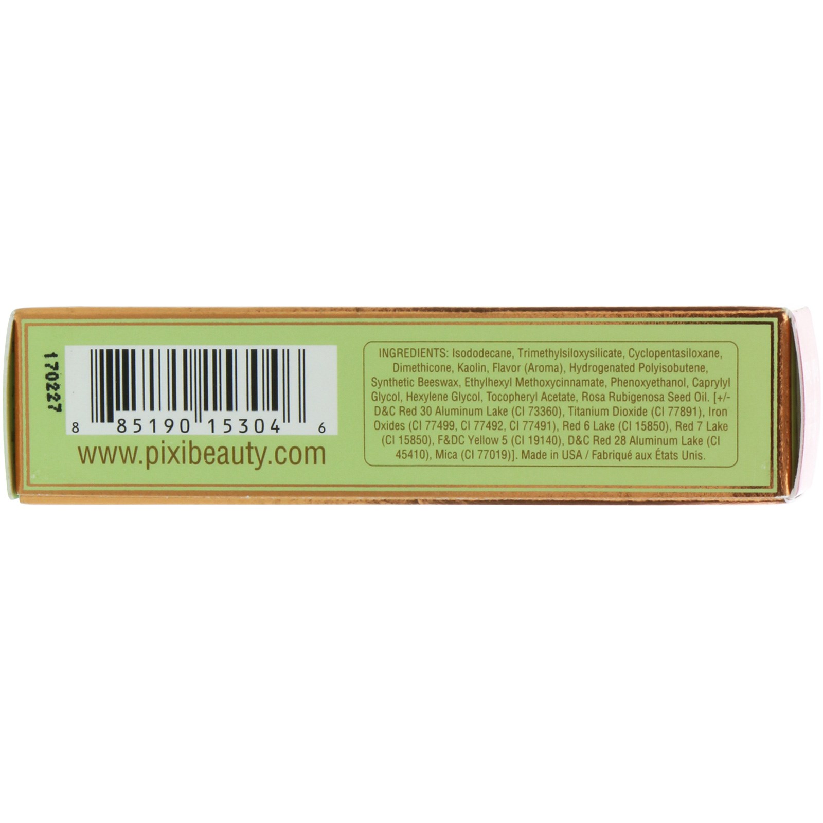 Isododecano, trimetilsiloxisilicato, ciclopentasiloxano, dimeticona, caulino, sabor (aroma), poliisobuteno hidrogenado, cera de abelha sintética, metoxicinamato de etilhexilo, fenoxietanol, caprililglicol, hexilenoglicol, acetato de tocoferilo, óleo de semente rosa rubigenosa. [+/- d & c vermelho 30 lago de alumínio (ci 73360), dióxido de titânio (ci 77891), óxidos de ferro (ci 77499, ci 77492, ci 77491), vermelho 6 lago (ci 15850), vermelho 7 lago (ci 15850), f & dc amarelo 5 (ci 19140), d & c vermelho 28 lago de alumínio (ci 45410), mica (ci 77019)].