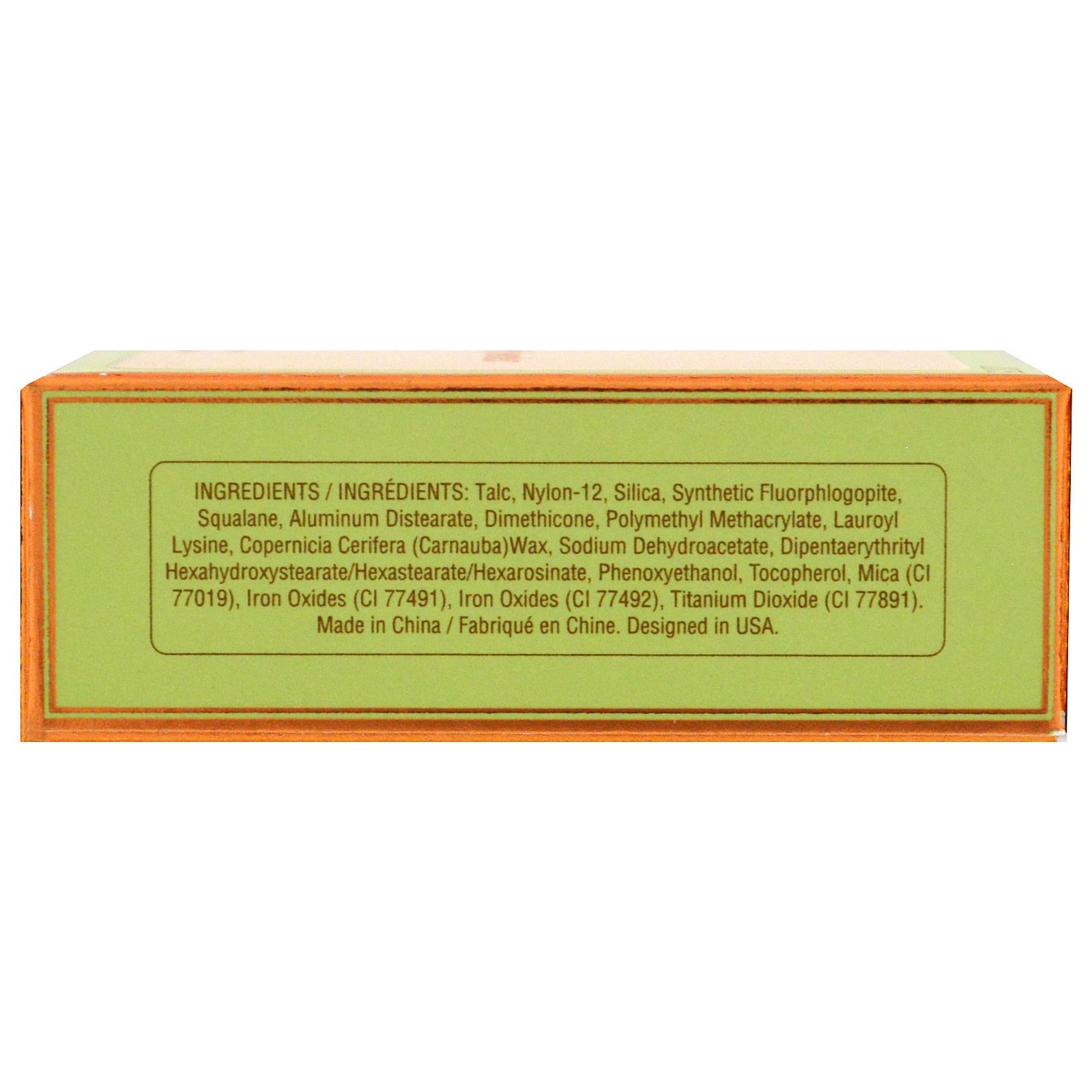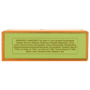 Talco, nylon-12, sílica, fluoroflogopite sintética, esqualeno, diestearato de alumínio, dimeticona, metacrilato de polimetilo, lauroil lisina, cera de copernicia cerifera (carnauba), dehidroacetato de sódio, hexa-hidroxiestearato / hexarosinato de dipentaeritritilo, fenoxietanol, tocoferol, mica (CI77019) (CI 77491, CI 77492), dióxido de titânio (Cl 77891).