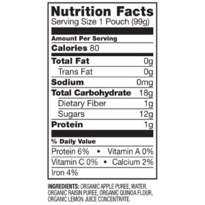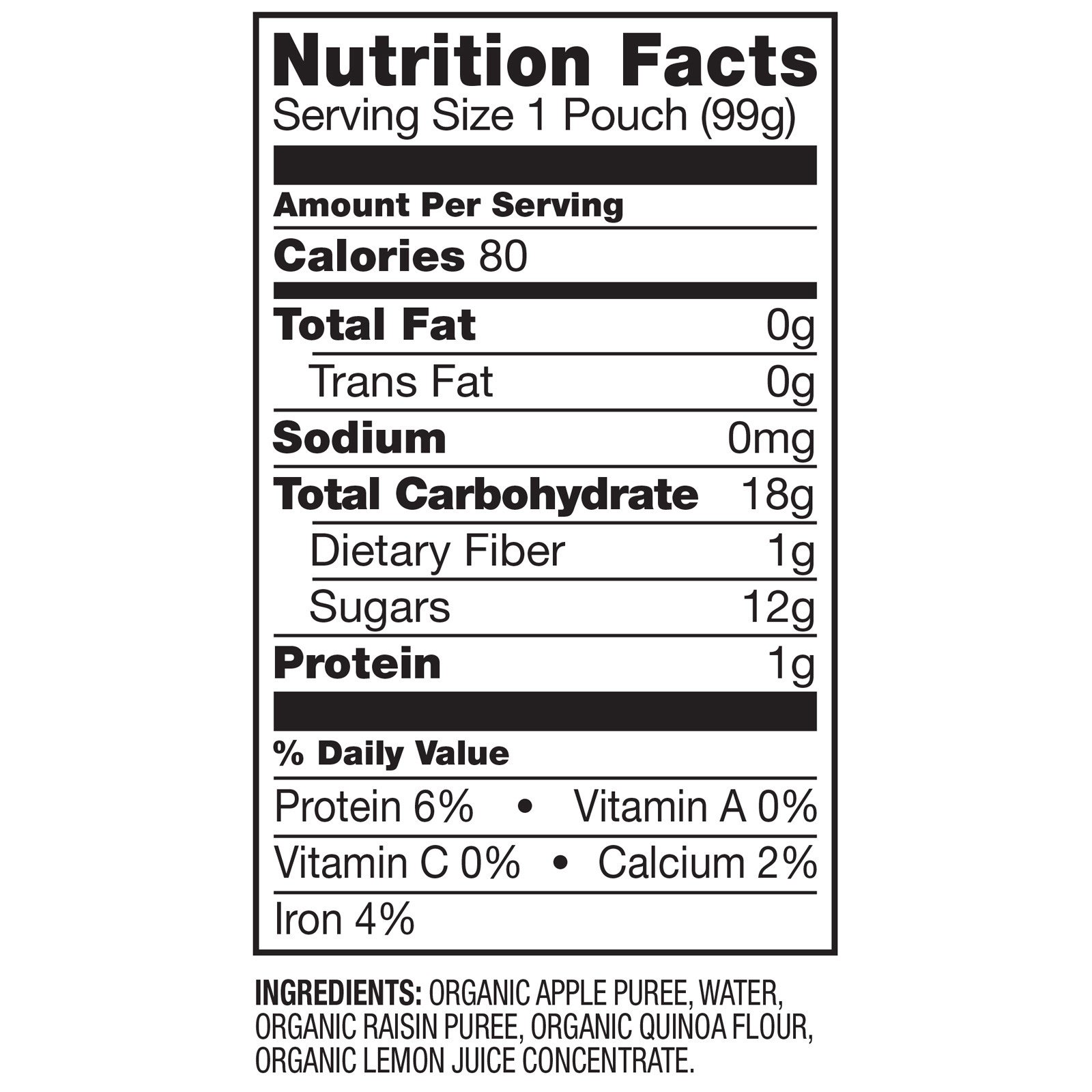 Puré de maçã orgânico, água, purê de passas orgânico, quinoa moída orgânica, suco de limão orgânico concentrado.