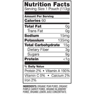 Puré de pêra orgânico, puré de cenoura roxo orgânico, purê de mirtilo orgânico, suco de limão orgânico concentrado.