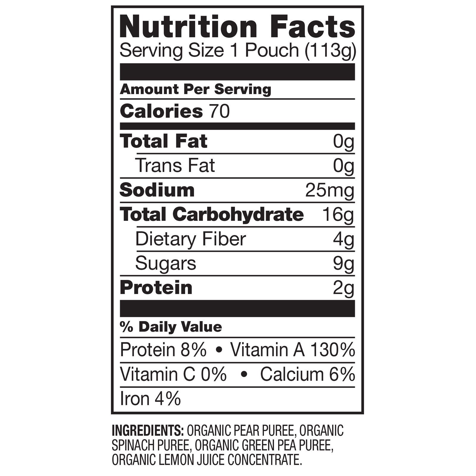 Puré de pêra orgânico, purê de espinafre orgânico, puré de ervilha orgânica, concentrado de suco de limão orgânico.