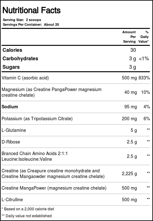 Recomendações de uso: Mix 2 scoops (14 g) in 8 oz. of cold water, or beverage of your choice, and consume 20 to 30 minutes before exercise. Do not exceed more than 4 scoops (2 servings) daily. On training days, consume 20 to 30 minutes before exercise. On non-training days, one serving may be consumed in the morning, with or without food.