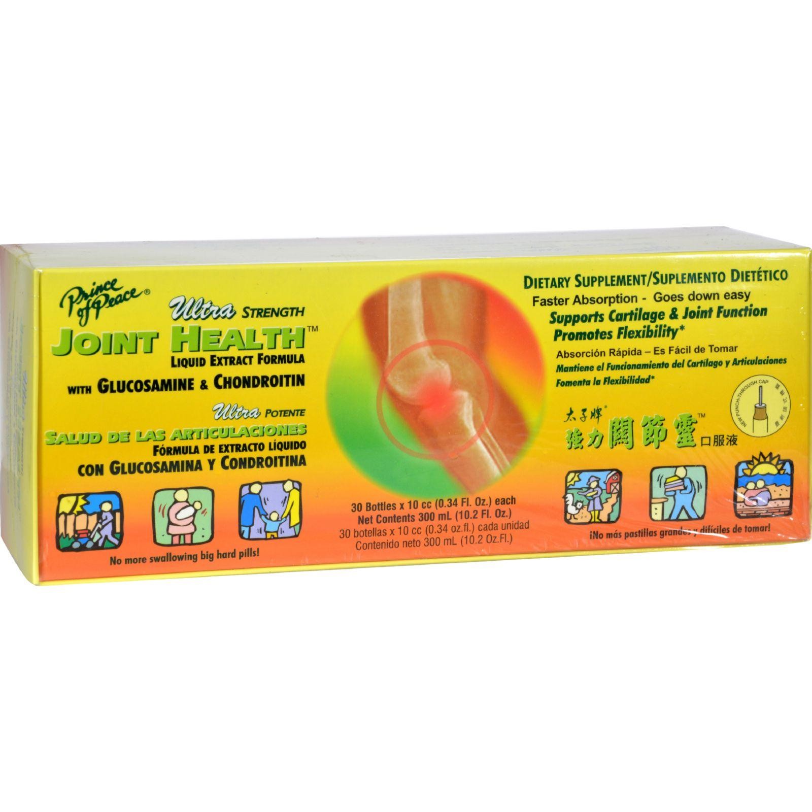 Prince of Peace Ultra Joint Health Description: Liquid extract formula with glucosamine and chondroitin Faster absorption – goes down easy Supports cartilage and joint function Promotes flexibility As we age, our body’s ability to produce the nutrients necessary for supporting cartilage declines. Glucosamine is a natural ingredient that supports the necessary building blocks of cartilage.In the body, Chondroitin is known to form, nourish, and replace collagen, which helps make up our cartilage. It attracts fluid to cartilage. This lubricating fluid acts as a shock absorber cushioning bones and joints. Prince of Peace Ent., Inc. brings you this highly refined Ultra Joint Health Extract in a special formulation with Glucosamine and Chondroitin. Using an advanced processing technique, this liquid extract formula goes down easy and helps for faster absorption. No more swallowing big hard pills! This special formulation helps support cartilage and joint function for everyday activities. Free Of Salt, starch, yeast, soy, dairy, preservatives, artificial flavor and artificial color. Disclaimer These statements have not been evaluated by the FDA. These products are not intended to diagnose, treat, cure, or prevent any disease.