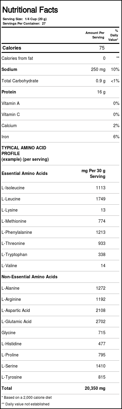 Recomendações de uso: As a high-protein, low-fat food, add 1/4 cup Eggwhite Protein dia to 12 oz. of leite ou other liquid. This powder can also be used in cooking recipes by mixing two tablespoons of powder with six tablespoons of water to equal two ovo whites.