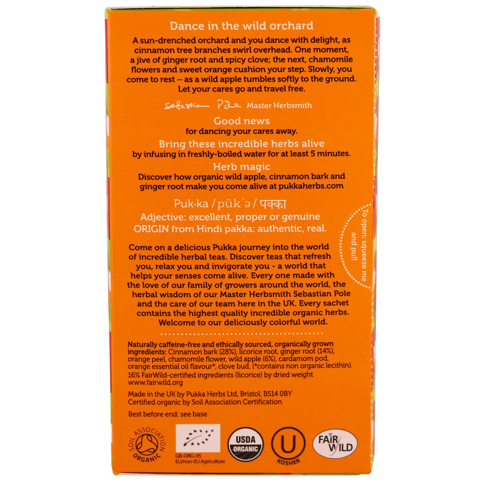 Ingredientes orgânicos de origem natural, sem cafeína e com origem ética: casca de canela (28%), raiz de alcaçuz, raiz de gengibre (14%), casca de laranja, flor de camomila, maçã selvagem (6%), vagem de cardamomo, sabor a óleo essencial de laranja * , cravo de cravo.