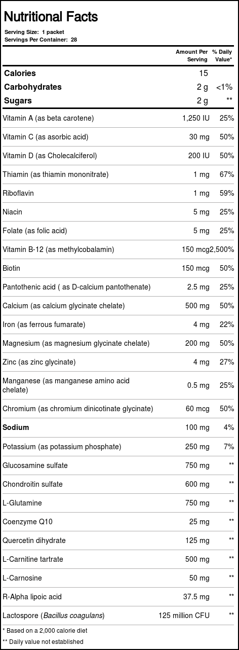 Recomendações de uso: As a dietary supplement, add 1 packet to 8-10 fl oz of cold water and mix well. Take 1-2 packets daily.