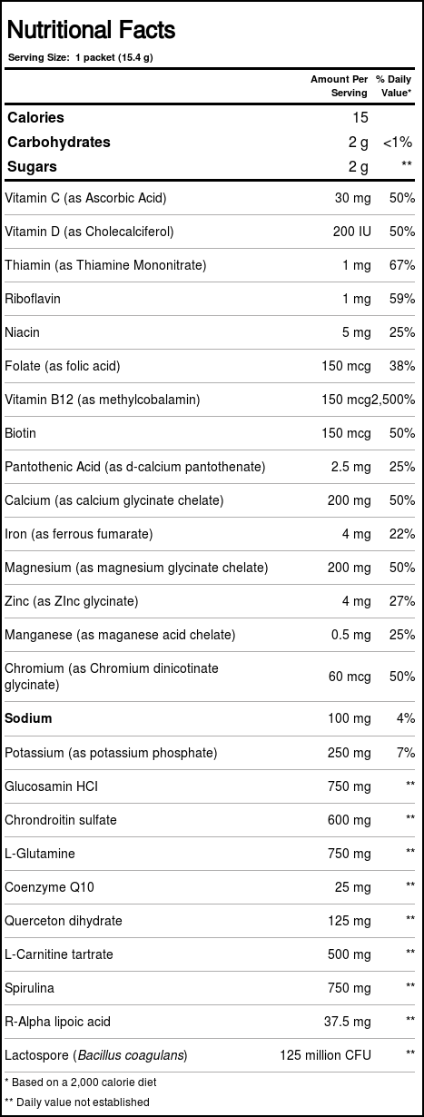 Recomendações de uso: Add 1 packet to 8-10 fl. oz of cold water and mix well. Take 1-2 packets daily.