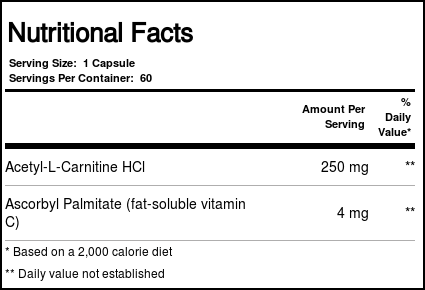 Acetyl-L-Carnitine, also known as carnitine, is an amino acid found naturally in the body that aids in proper brain function, metabolic rate and nerve repair. Carnitine supports cognitive function and can actually improve your ability to learn through better neurotransmitter activity. Acetyl-L-Carnitine has also proven to be an effective weight loss supplement, boosting the metabolism to promote the burning of stored fat for cellular energy.